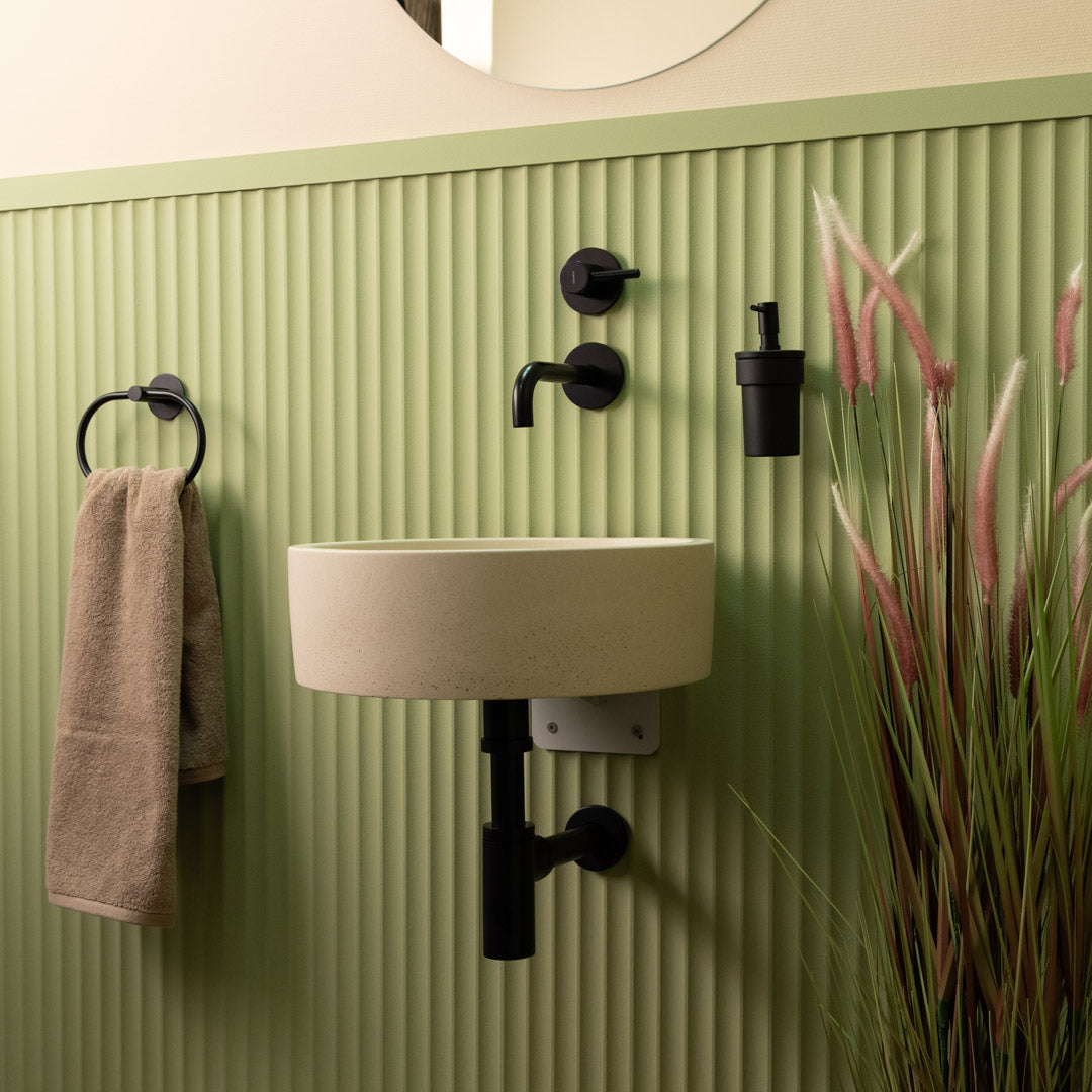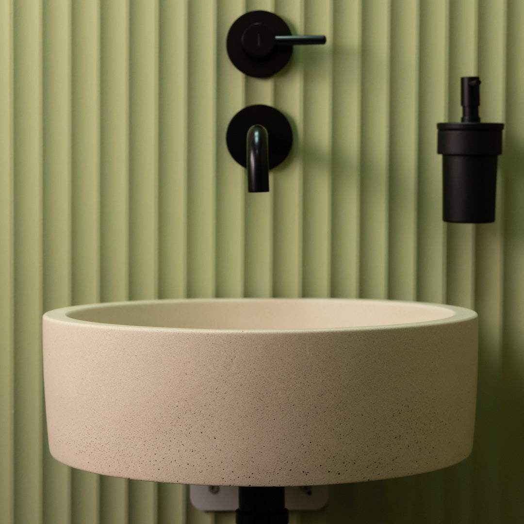Crafted by hand from high-quality concrete, this round sink features soft edges and a smooth matte finish that suits a wide range of interior styles. Each basin is unique, displaying natural tonal variations and surface markings that emphasize its handcrafted character. Designed for easy countertop installation, it offers both durability and understated elegance for everyday use.